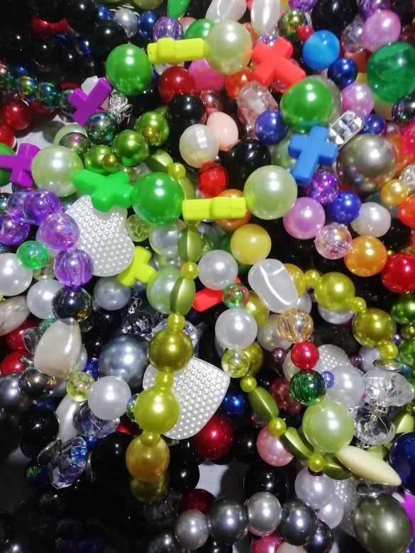 E’ stata utilizzata in prevalenza la plastica iridescente per dare, con la sua luminescenza, ancor più luce al monile in un vortice di colori avvolgenti, colori che spaziano dal bianco e nero a tutta la scala cromatica.